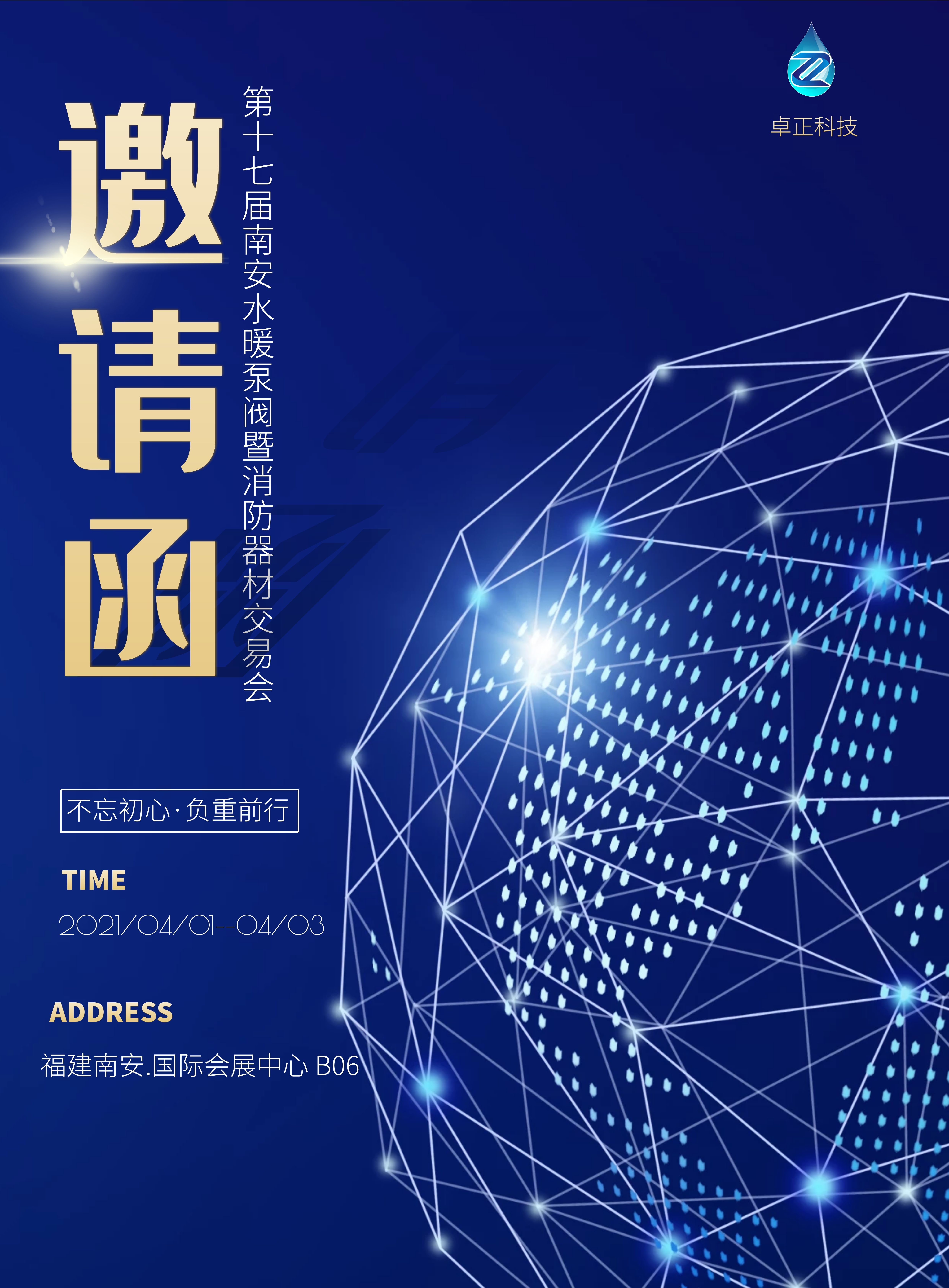 您好!我們誠摯邀請您觀展在2021 年 4 月 1 日至 3 日福建南安國際會展中心舉辦的第十七屆南安水暖泵閥暨消防器材交易會,卓正科技應展會邀約將如期趕赴參展。