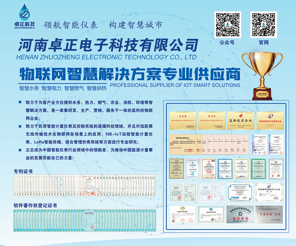 河南卓正電子科技有限公司,專業(yè)的物聯(lián)網(wǎng)表應用方案提供商,擁有一支多名博士、碩士組成的核心研發(fā)團隊,率先將NB-IoT、LoRa遠傳技術、智能閥控技術應用于水務、熱力、燃氣、農(nóng)業(yè)、消防、環(huán)境領域,以“領航智能儀表 構建智慧城市”為企業(yè)使命,立志成為中國智能儀表行業(yè)領域中的領跑者,為推動中國能源計量事業(yè)的發(fā)展貢獻自己的力量!